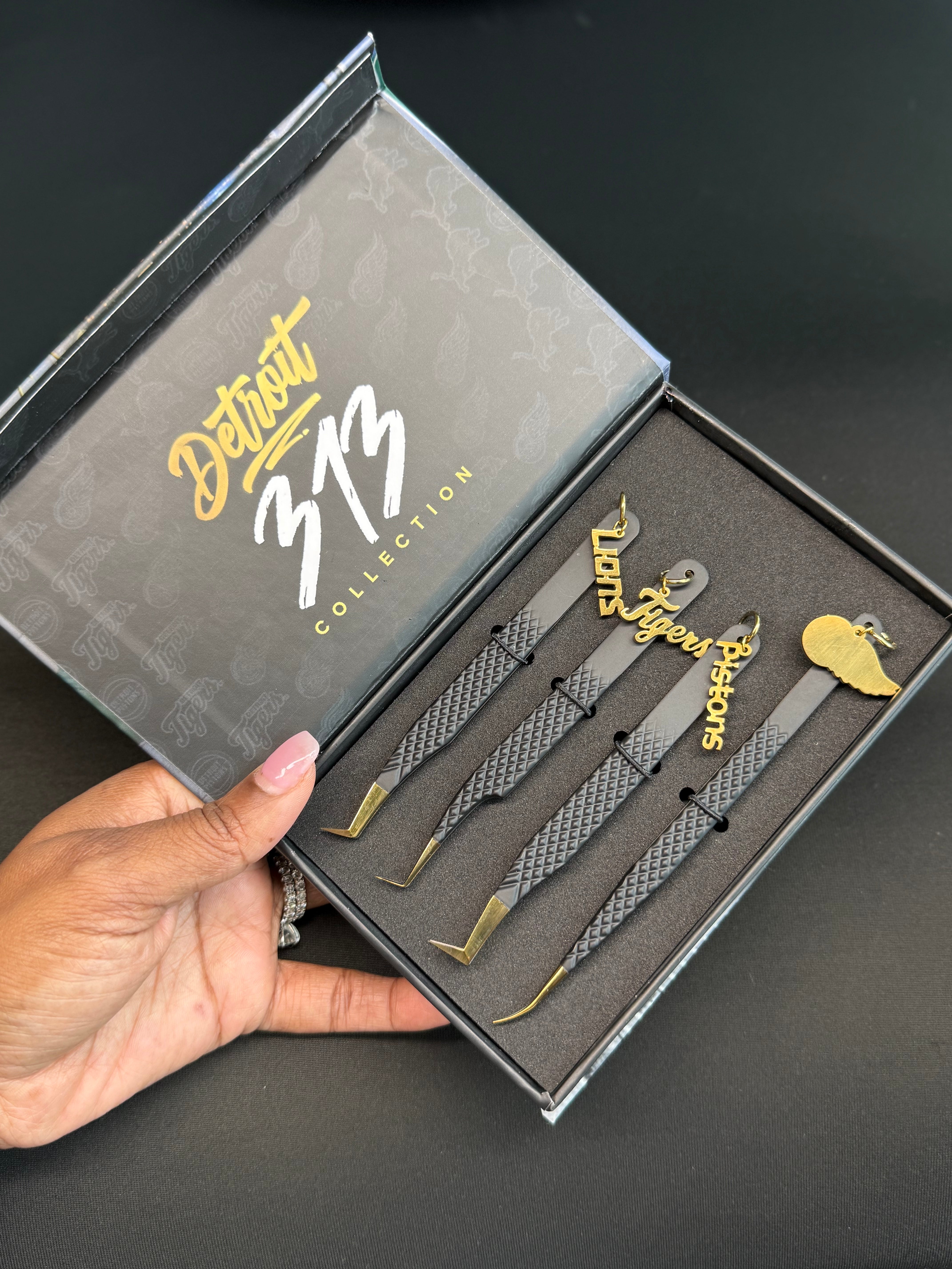 Introducing the 4pc "313 Tweezer Collection", a must-have set for all your tweezing needs. The collection includes 4 precision tweezers from the Detroit 313 line, designed for ultimate accuracy and grip. Upgrade your tweezing game and achieve flawless lashes with this exclusive set.